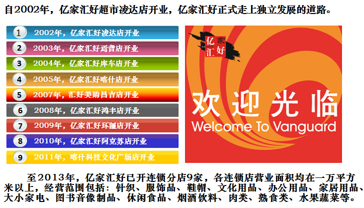 億家匯好商貿有限責任公司于2002年成立,并從臺灣引進連鎖經營職業管理團隊,統一管理旗下各地的連鎖超市。公司通過多年的穩健發展,至2013年底,億家匯好商貿有限責任公司已成為擁有員工近3000多人,下轄一個配送中心和9家連鎖超市的大型綜合性零售企業。總經營面積11萬多平方米,配送中心輻射公司所有超市,年配送額可達2億元。公司大量吸納下崗職工,經過崗前培訓,提高勞動技能,實現了他們的再就業,為維護社會和諧穩定做出了貢獻。2013年,巴州億家匯好商貿有限責任公司在自治區零售業中穩踞前三位,是自治區重要的流通龍頭企業,2013年年銷售收入達10億人民幣。多年來,公司一直重管理、抓實效、運用先進的管理手段和營銷理念,秉承億家匯好人 時時尋求效率創新,事事講究專業技術的文化精髓,創造了良好的經濟效益和社會效益。公司先后多次被消費者協會評為誠信單位,并多年被評為重合同,守信用單位。